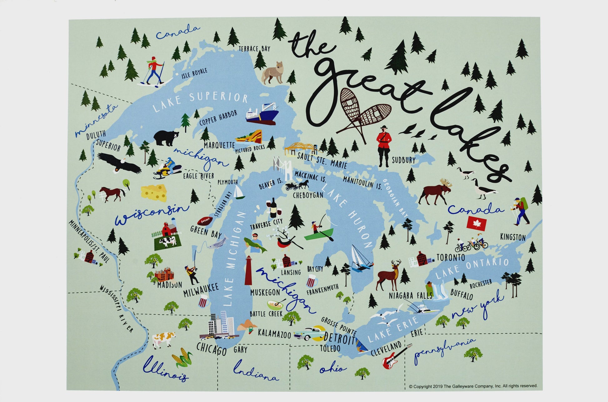 Galleyware's whimsical depiction of the Great Lakes and its surrounding areas. Featuring all of the great cities and tourist attractions on a vibrant 18" x 28" kitchen towel.