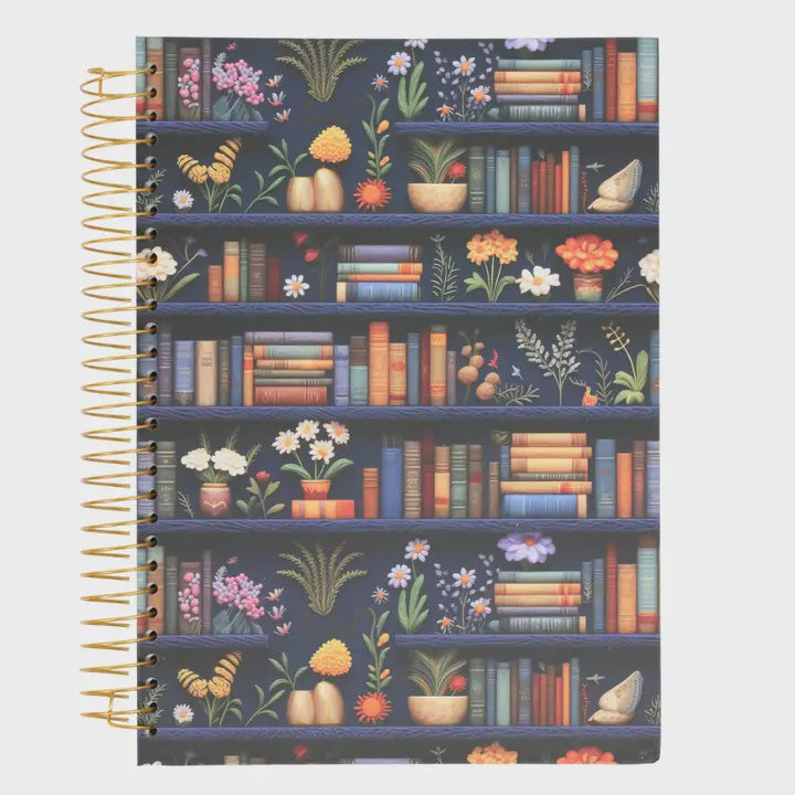 This reading themed notebook features a beautiful bookshelf covered with plants and rainbow books. Perfect for any book lover.