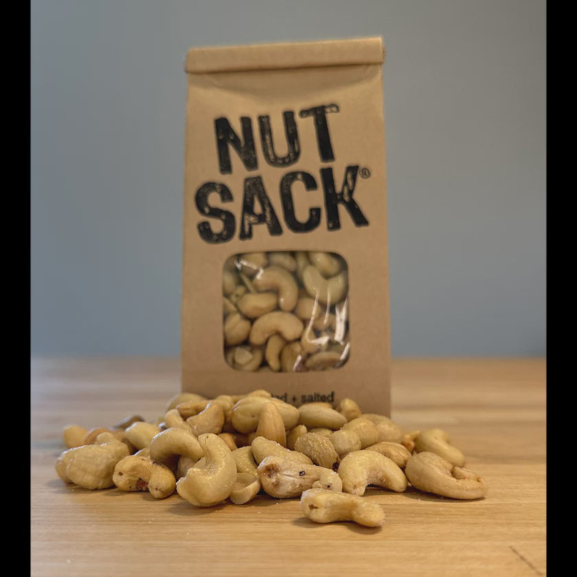 The Roasted Salted Cashews Nutsack contains whole cashews, roasted with pure coconut oil and sprinkled with a little sea salt.